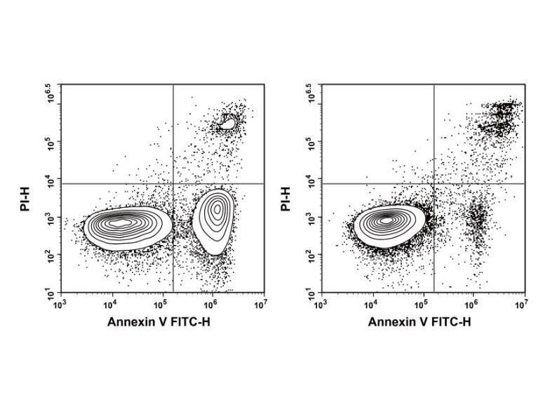 | 检测原理 | Annexin V是一种钙离子依赖性磷脂结合蛋白,与磷脂酰丝氨酸PS有高度亲和力,可通过细胞外侧暴露的PS与凋亡早期细胞胞膜结合,将Annexin V标记荧光染料,利用流式细胞仪检测细胞凋亡。 细胞核染料(PI,DAPI,7-AAD)可与双链DNA特异性结合,并产生强烈的荧光,正常情况下无法透过细胞膜。由于凋亡晚期或坏死细胞膜丧失完整性,细胞核染料(DAPI、PI、7-AAD)可进入细胞内对DNA进行染色,与Annexin V搭配使用,可区分处于不同凋亡时期的细胞。 | | 应用类型 | 细胞凋亡检测;Annexin V | | 检测方法 | 荧光 | | 样本类型 | 细胞 | | 检测时间 | 40 分钟 | | 检测仪器 | 流式细胞仪 | | 荧光 | FITC | | 激发/发射波长(EX/Em(nm)) | 490/530 | | 流式仪通道设置 | FITC | | 自备试剂 | PBS(PB180327), 去离子水 | | 运输条件 | 冰袋 | | 保藏温度 | 2~8℃,避光保存 | | 保质期 | 12个月 |